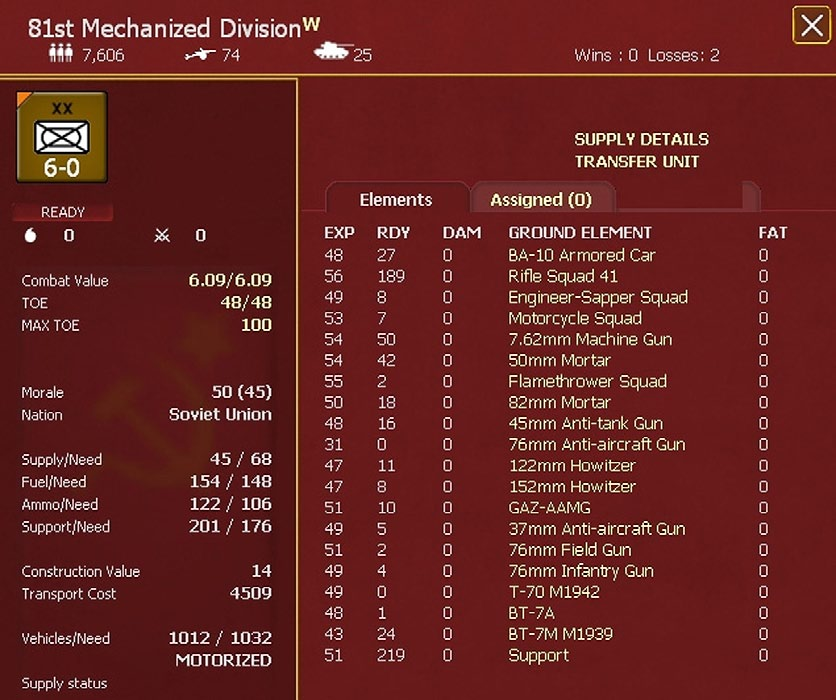 Individual units may have different morale levels to the current National Morale level. This can be due to the morale allocated to the unit when it first enters the game. For example, some of the units that will be transferred from the Soviet Far East in late 1941 will have a higher morale to reflect their elite status and experience gained in the various clashes with the Japanese up to 1939.