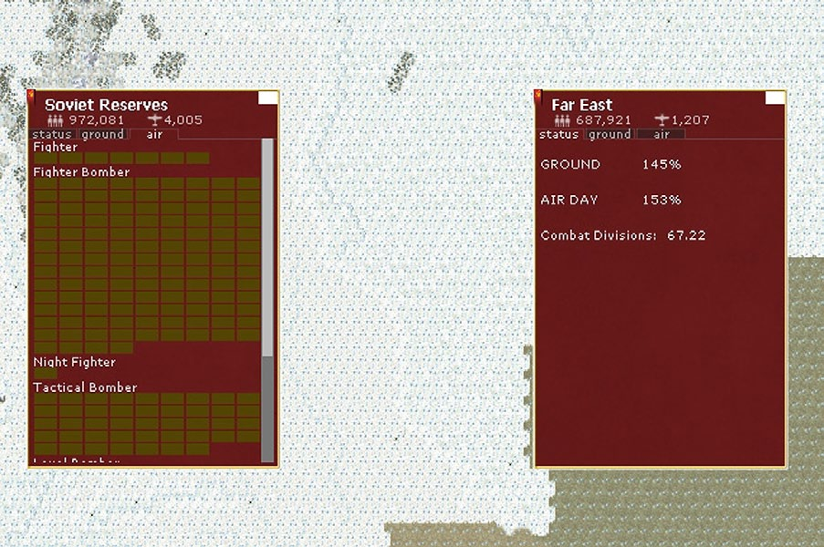 The Event system (13.5) is used to reflect progress in other theatres and uses triggers (such as date or geographical locations) to change allocations of manpower, administrative points and tracks combat and losses, Western Allied progress and national morale. Allied bombing will also affect German industrial production.