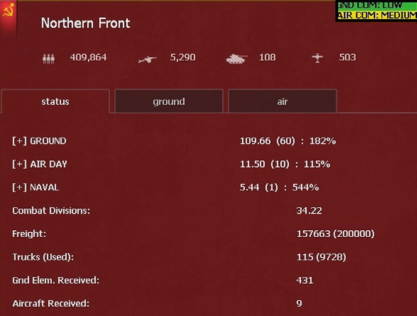 Thus combat intensity determines the losses that will affect the garrison in each Theatre Box. If you want to check what this means in practice, you can review ground and air losses in the various theatres using the Event Log (36.9).
