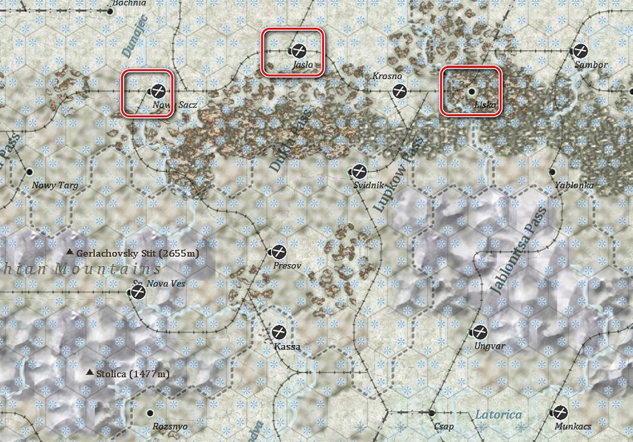 There is a 50% chance that Slovakia will surrender at any date after 1 January 1942 in a turn if the Soviets occupy one of the towns or cities in Slovakia or the towns of Nowy Sacz, Liska and Jaslo (see figure 14-3 below).