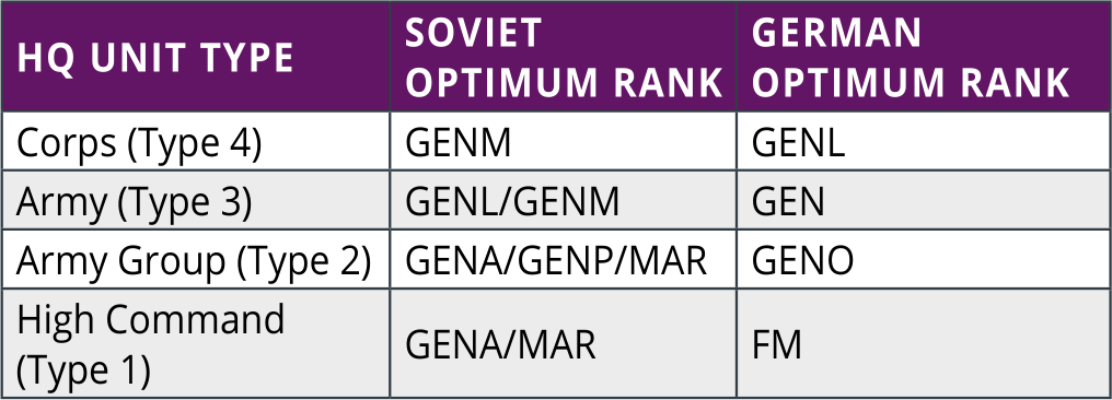 The Optimum rank for each command is summarized in the below table. An exception is that for air HQ units, the rank required to command the HQ is one lower than that of other HQs.