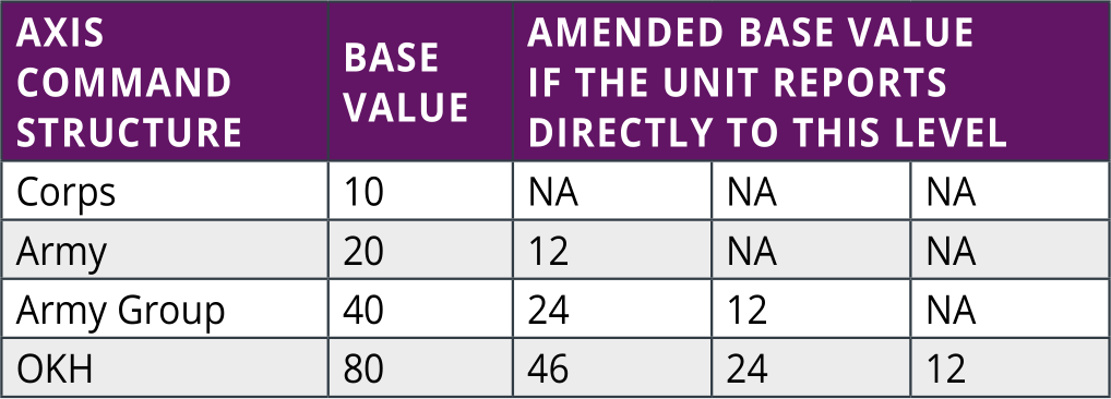 In this case, the base value for such higher leaders will be amended according to the level of command the unit reports to, as:
