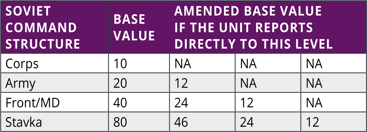The chance to pass a check is dependent on how a unit reports to the chain of command. The expectation is that Axis units will report to a Corps HQ and that, after August 1941, Soviet units will report to an Army HQ.