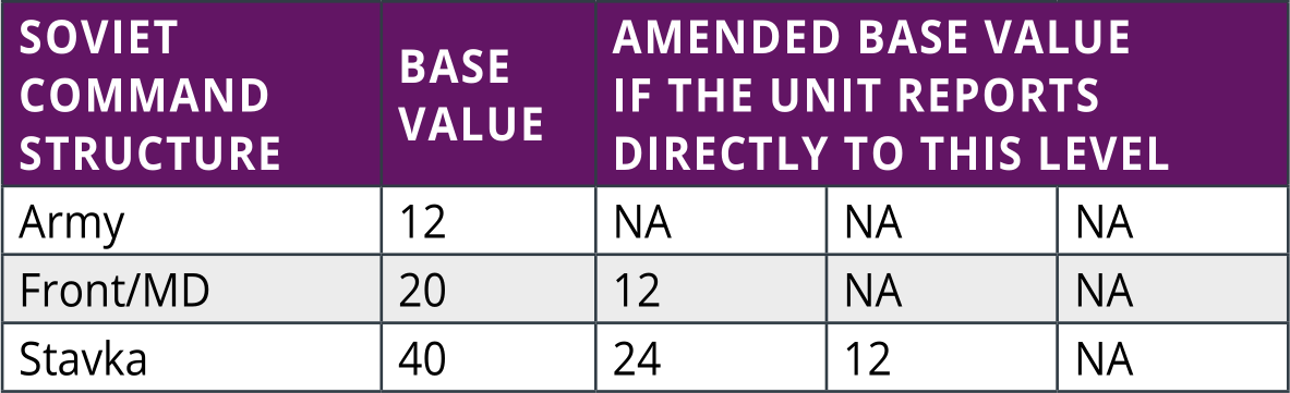 - A Soviet unit reports to a normal Combined Arms Army in 1942, again assume that all the leaders in the chain have a base value of 6: