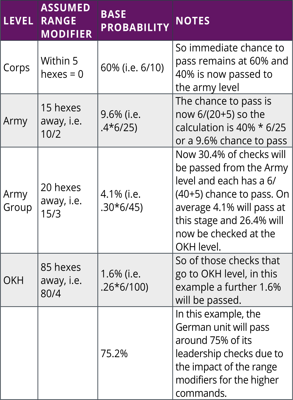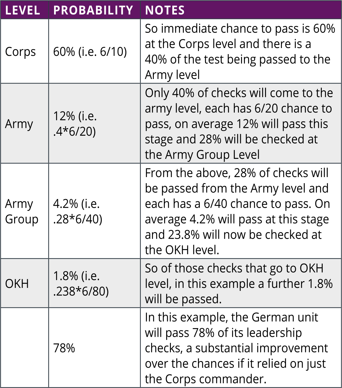 Note – for simplicity this example uses the same leadership value at each stage but for example a leader with an admin score of 8 in the Army Group would increase the chance to pass that step to 5.6% and the overall chance to pass the test to 79.3%.