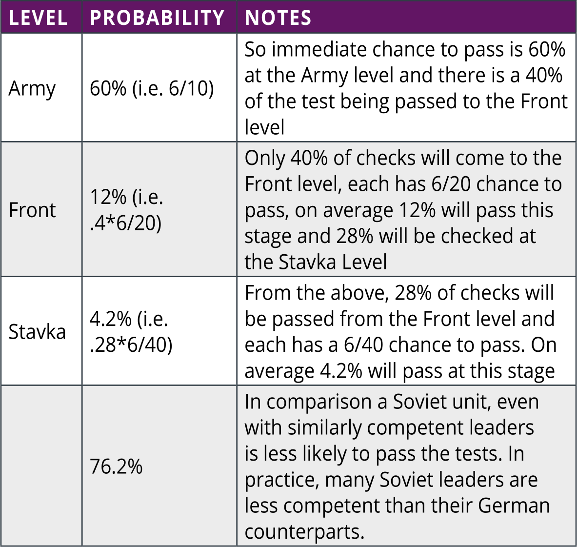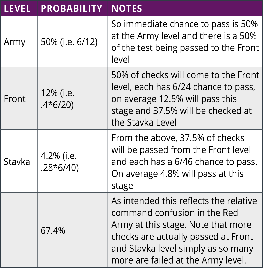 From these calculations it is worth noting that the Soviets gain from better commanders at the Front/ Stavka level as more tests will be passed to that level. This will be compounded as even late in the game, many Soviet army commanders will have low ratings for some of their leadership values.
