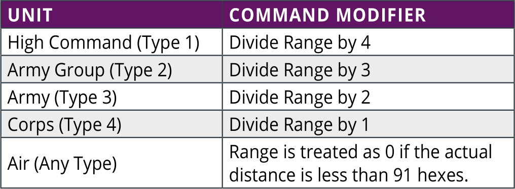 Each level of headquarters unit has a designated number that the range from it to the unit is divided by to get the modifier after first subtracting five from the range to the HQ units, with the value never set below zero. This means that tracing five or less hexes to any HQ or less than 91 hexes if to an air command HQ results in no range penalty.