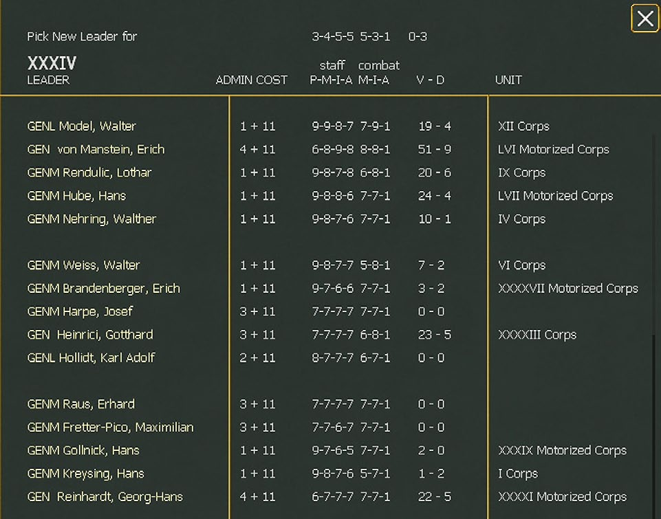 For Corps and Army headquarters units, a leader will be automatically promoted to an appropriate rank if selected. If promoted this way, the leader must make a check for each skill rating to see if it drops one point. There is less of a chance for a particular skill rating to drop if that skill rating has been previously reduced.