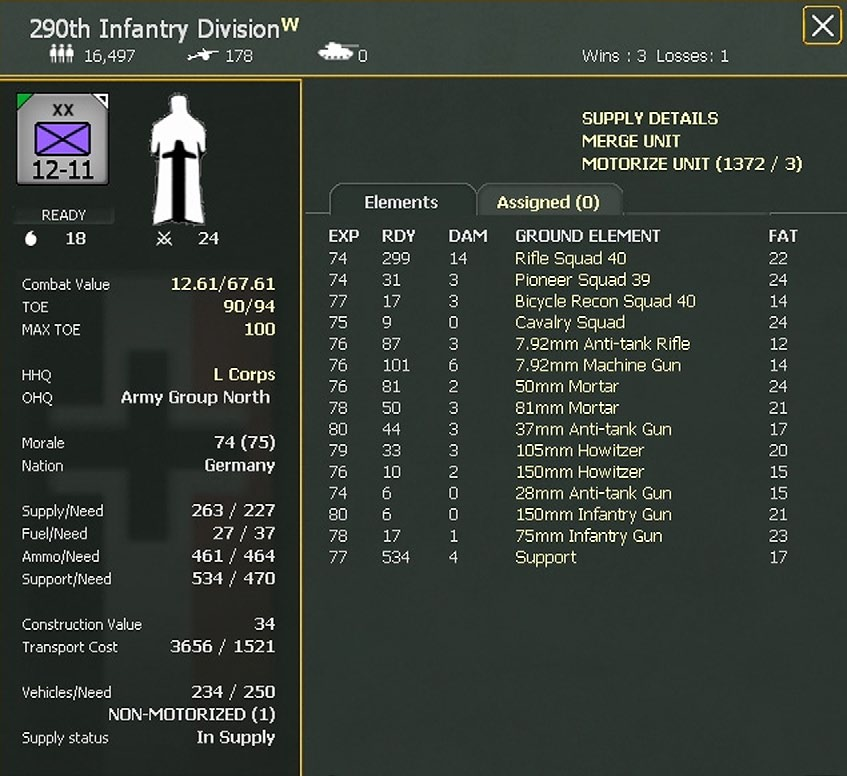 For example, if the German 290 Infantry Division wins a battle then the commanders of L Corps, 18 Army, Army Group North and OKH are all credited with a win.