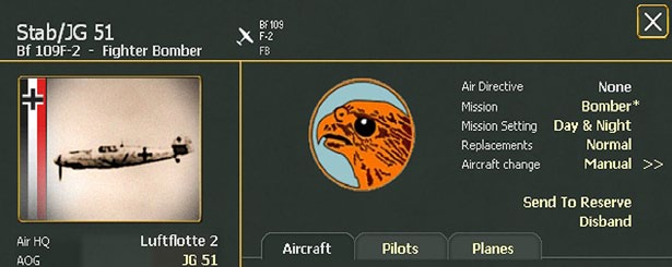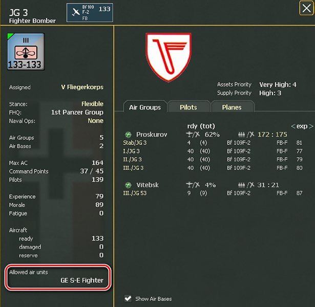 While the game engine tracks individual pilots and planes, the lowest command unit available to the player is the Air Group Unit (16.4). This includes a variable number of planes and pilots and can be assigned to a variety of missions depending on the type of planes it is equipped with.