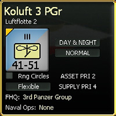 All other Air Units are deemed to be active and will take part in air operations according to the type of plane and Air Directive selected. This includes being set to fly missions only during the day (DO), only at night (NO) or both (DN).