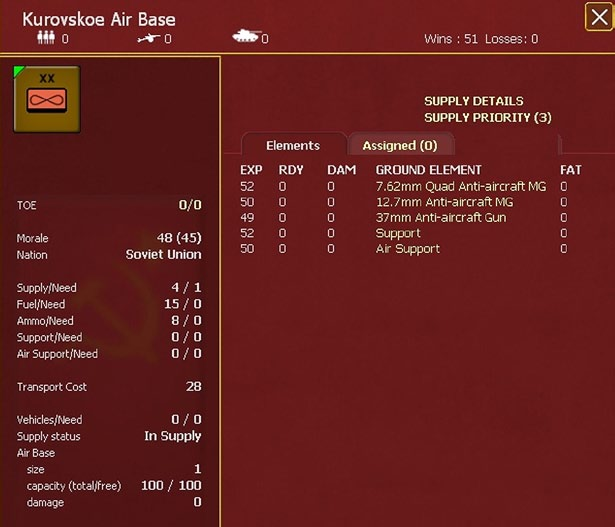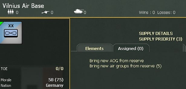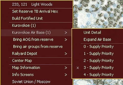 Remember that unlike depots and HQ units, if an airbase is to #0 supply priority it will receive no supply allocation. The supply priority can be changed in the Commanders Report (35.7) or by right clicking on the map hex with the air base or via the general information box (6.2.1).