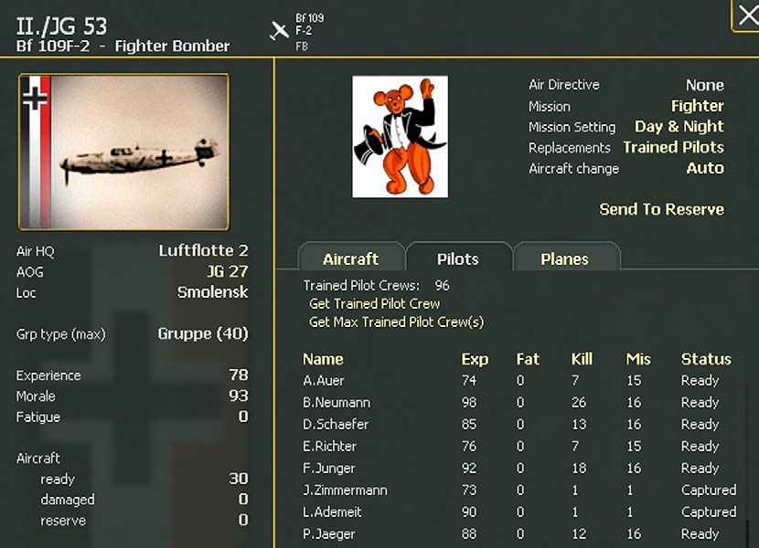 Pilots will remain assigned to an air group unit unless they are either killed in action, the air group unit is disbanded or the air group is sent to the reserve (16.7.3). Wounded pilots will remain with their assigned air group unit and will eventually be healed and return to flying duties. The air group unit detail window (37.16.13) has a pilot tab for air group units that lists each pilot by pilot number, and shows their experience, fatigue, air kills, missions flown and health status.