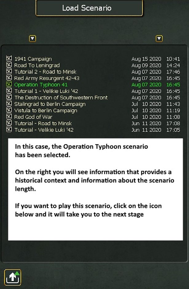 - If you click on a scenario, the text will change to green and on the right hand side a scenario briefing will appear. At the bottom of the screen will appear a little disk icon click on this to ‘load the scenario’;