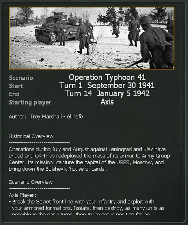 - On the right hand side you will see a summary of the scenario, setting out the number of turns, a brief overview, a short guide as to how to win and the number of Administrative Points (4.3.12 and Chapter 9) allocated each turn;