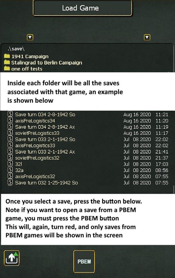 You will be presented with a list of all the folders of the games you have created. The list will be different if you have the PBEM box ticked or not.