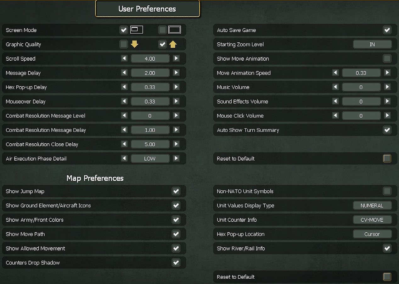 The User Preference settings can be used to customize aspects of the interface. Many of these settings can be changed at any time during the player turn, but some require the player to exit the game and reload prior to the change taking place.