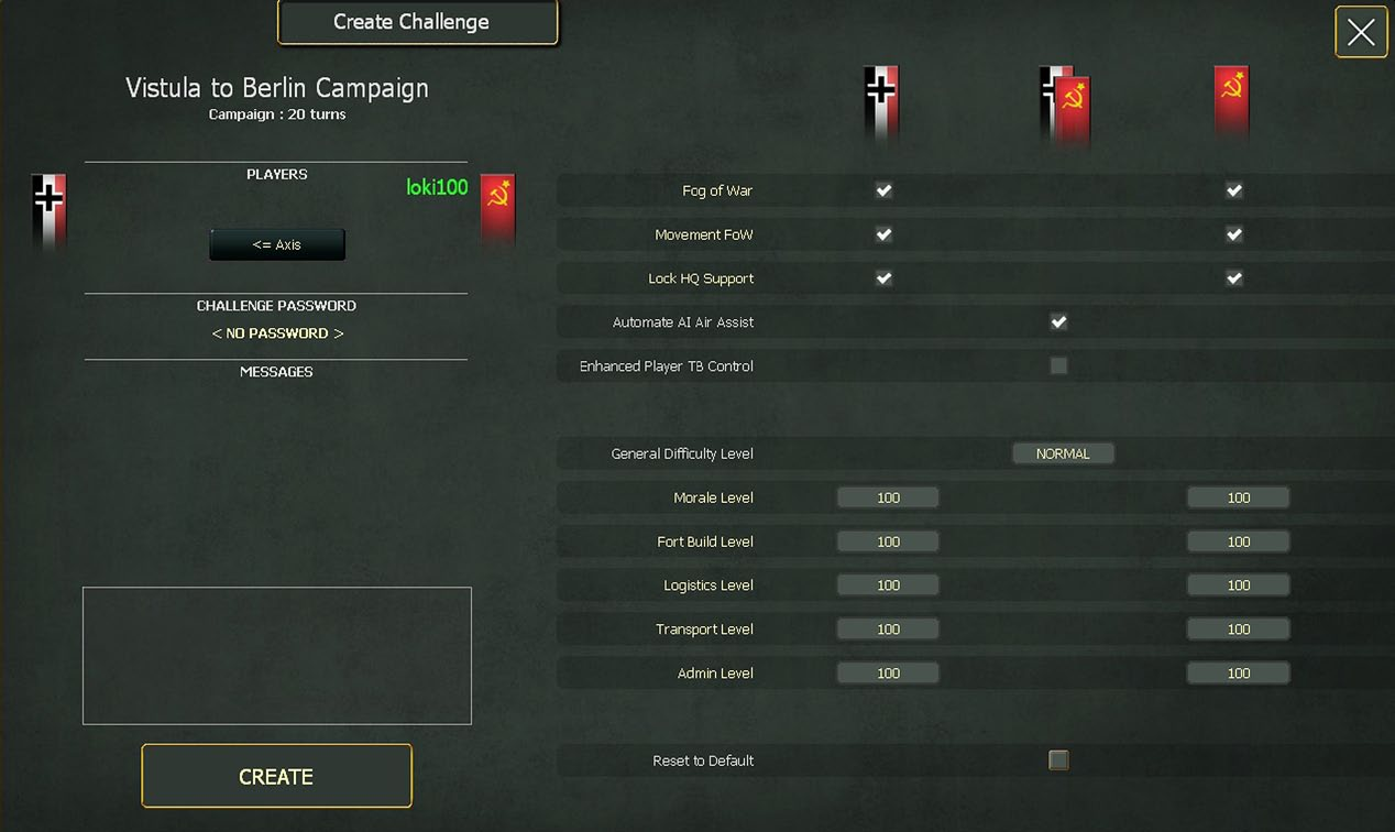 To create a challenge, select that option, select the scenario you wish to play and amend the settings as you wish. If you password protect this then only someone you give that password to can take up the game.