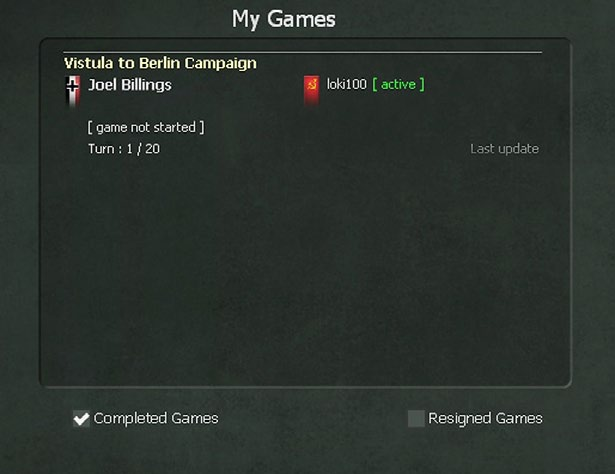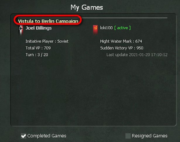 If desired, the player may use the ‘Resign” button. ’Show Completed’ and ‘Show Resigned’ buttons on the screen can be used to filter the game list. Upon completion and selection of the end turn button (F12), the scenario listing will be updated to reflect that it is the other side’s turn.