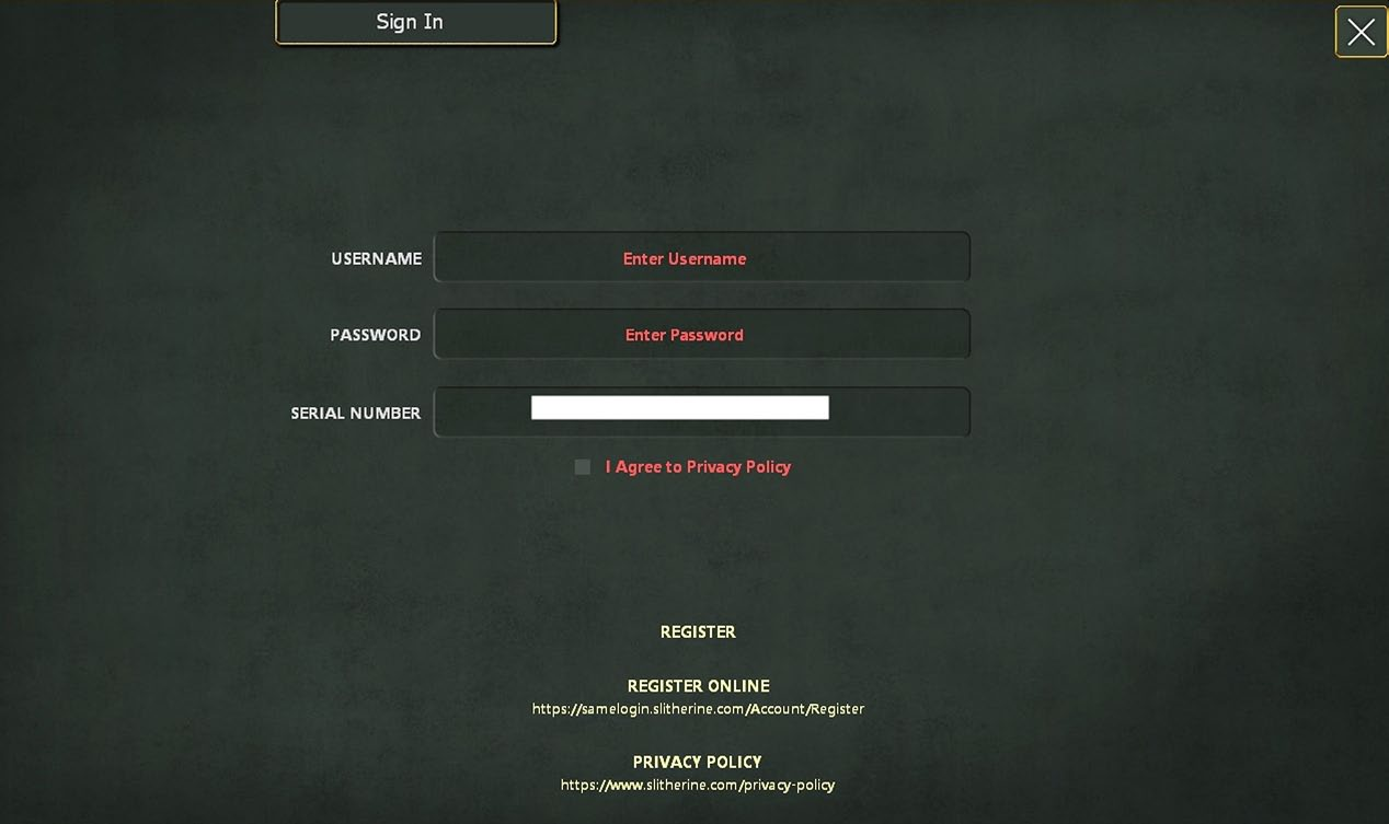 If the player does not have a Slitherine account, then they will select the register button, which will bring up the account registration screen. Here they will be prompted to enter a username, password and e-mail address to obtain a Slitherine account.