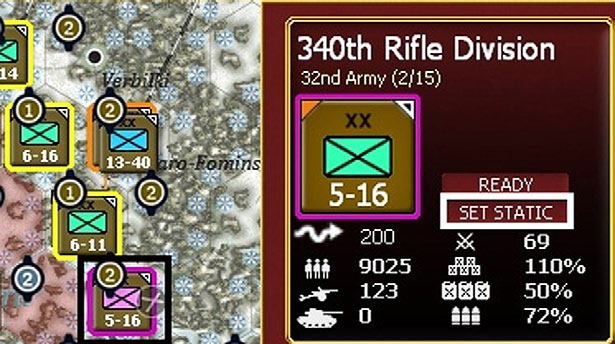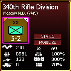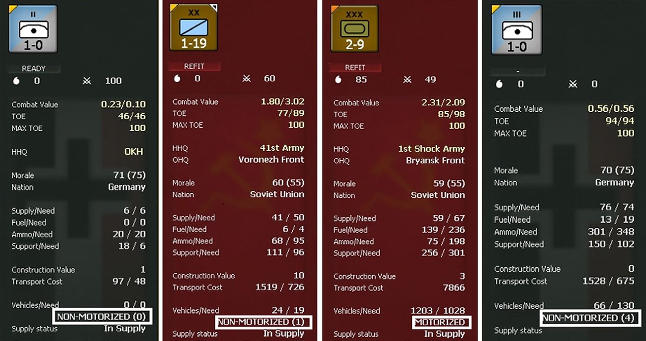Ground units are either motorized or non-motorized. Motorized and Non-Motorized Units are treated in different ways in terms of tactical movement and supply. Motorized units use vehicles and fuel for tactical movement, combat, and supply, while non-motorized units have far fewer vehicles and depend on supplies for tactical movement and supply. Players can verify whether a unit is motorized or non-motorized on the right hand side of the applicable unit detail window.
