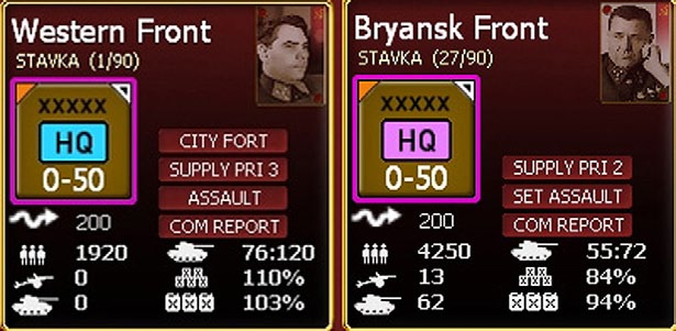 In this image, Western Front is set to assault status (and has extra command capacity) while Bryansk Front is not (but could be converted if the Soviet player has not exceeded their capacity for the current turn).