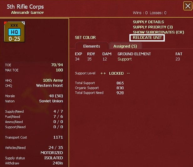 The player can relocate most types of headquarters unit, including rail repair units, by selecting the “RELOCATE” button in the right upper corner of the HQ unit’s detail window (37.2). Relocation is similar to a displacement move (23.13), but is a voluntary action and results in the unit being moved to a friendly town, city or urban hex that is in supply.