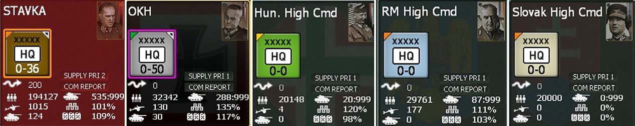 Army Group//OKL/Hungarian, Slovakian, Romanian Air Commands/Regia Aeronautica; Soviet Fronts, Military Districts (Type 2): These are ground or air headquarter units with large capacities that are attached to a High Command (Type 1) headquarters unit and normally serve as higher headquarters to the rest of their nations units.