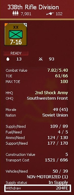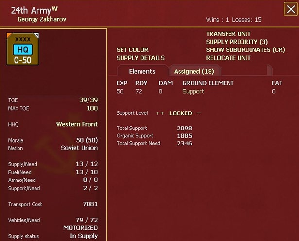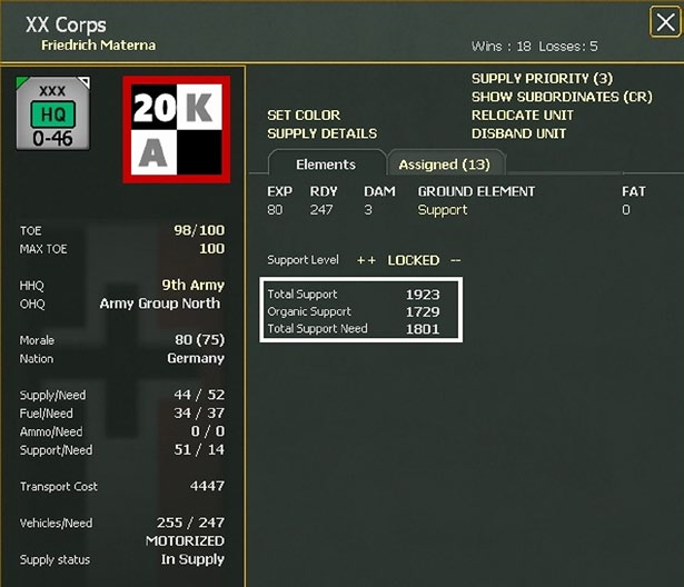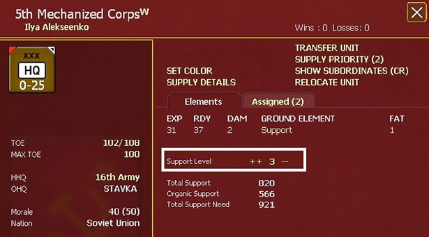Each unit has a notional TOE for support squad ground elements but the actual requirement for support squads, listed by ‘NEED’ in the unit’s detail window, is based on the current strength, and type, of the unit. This need is recalculated during each logistics phase and, if appropriate, during the air phase and when units motorize/de-motorize or if they change to/from Static mode.