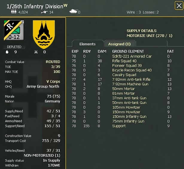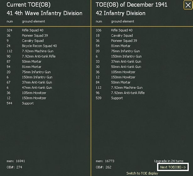 All ground units consist of a certain type and number of ground elements and have a Table of Equipment (TOE) that determines the number and type of ground elements required for the unit to be fully manned and equipped. For most units in WiTE2 this TOE will change across the course of the game,