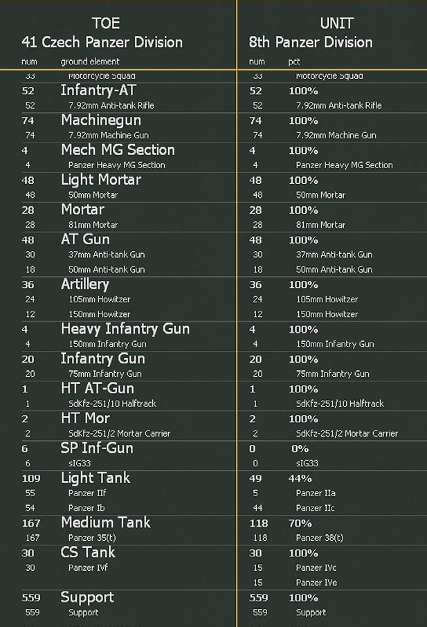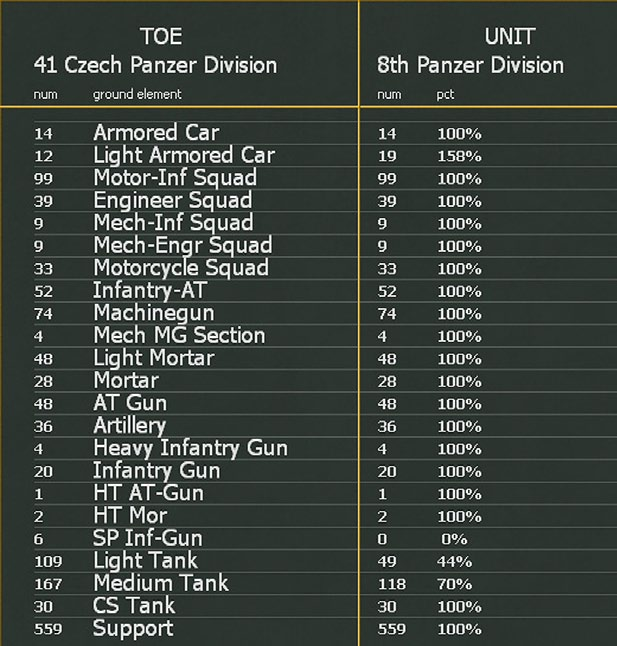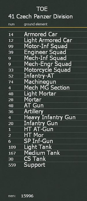 The generic TOE lists the ground elements the unit should contain, this will specify for example that the unit needs x medium tanks but not the actual models to be assigned. Note that different apparently similar units can be assigned to different generic TOEs, so for example some German Panzer divisions in 1941 will be assigned to the Czech TOE rather than the Standard TOE.