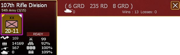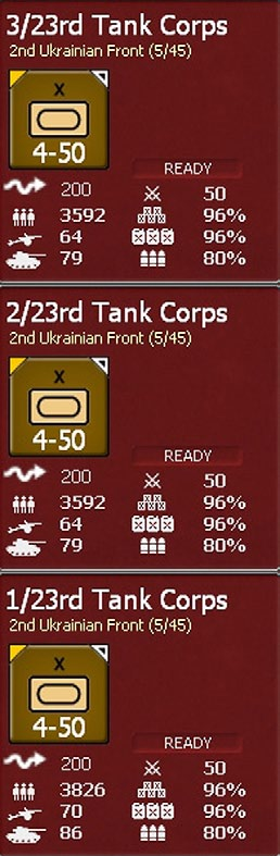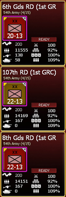 Soviet Tank Armies: As with German Motorized or Panzer Corps, there is a bonus of +1 on the admin rating of the commander for motorized units. In addition, if a Soviet Army is designated as a Guards Tank Army there is an increase of 1 in the Command Capacity.