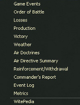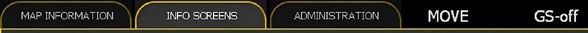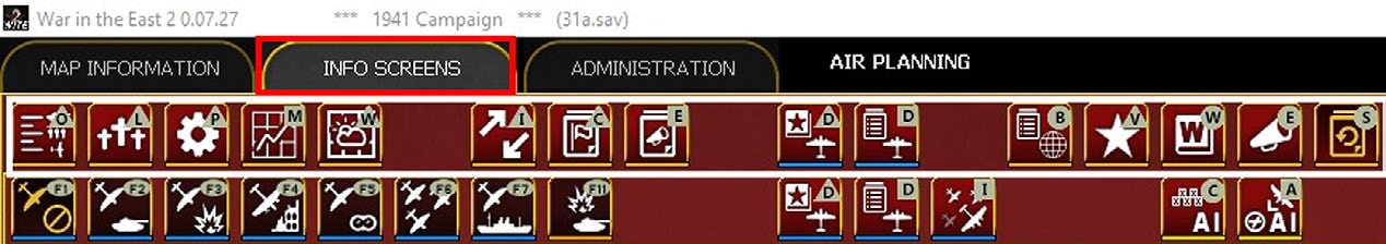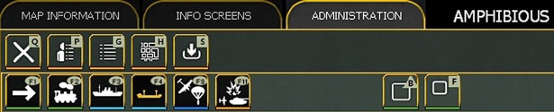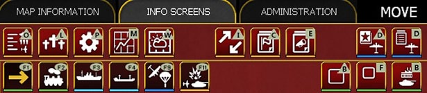 On the left hand side here are three tabs. These give access to the detailed tabs in the row below and the available set will vary depending on if ‘map information’, ‘info screens’ or ‘administration’ is selected. Some options will only appear during either the air planning or ground movement phase, others are available in both.