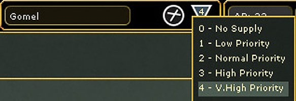 The depot priority level can be opening the location tab, by right clicking on the hex and selecting depot to access the priority options or from the tab on the left hand of the top row. In the example above, Eysk can be changed from priority 1 by clicking on the depot symbol and selecting a new priority level from the drop down menu. This can also be done from the city view screen or using the right click drop down menus.