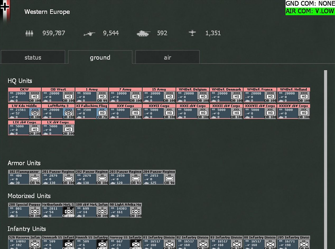 - Display Order of Battle Screen: This screen provides the phasing player a complete Order of Battle down to the individual unit level and also provides a summary of the status of each country’s army and air force (36.1).