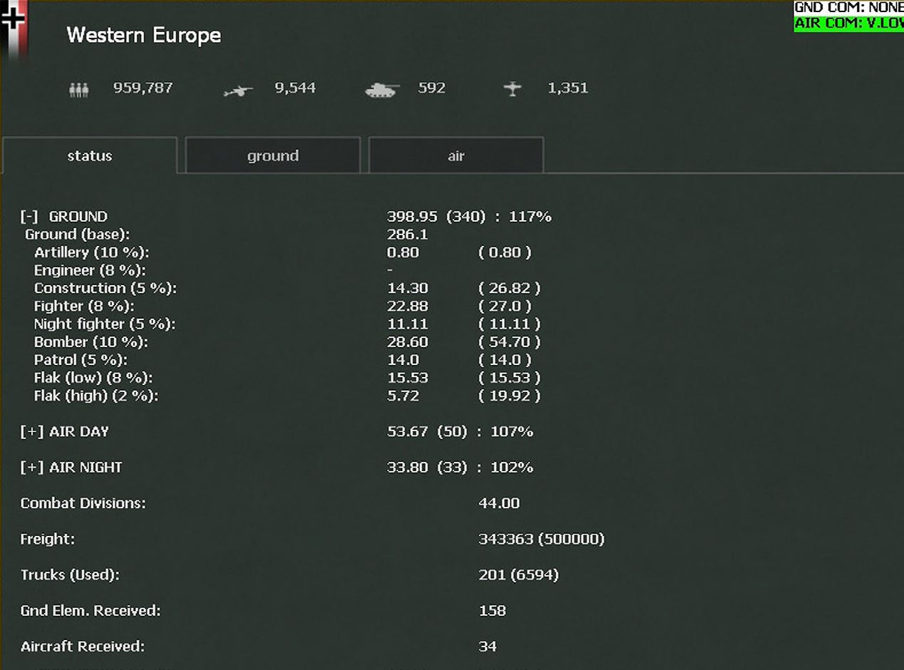 Status. Shows the land and air combat values of the units currently deployed in that theatre, the numbers of fighter, bomber and patrol aircraft. If you click on the [+] key, the full break down of how this cv is made up will be shown.