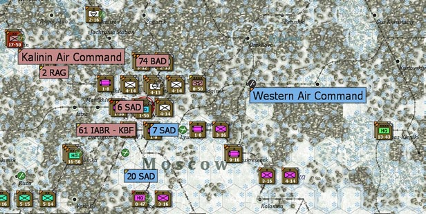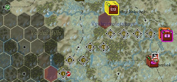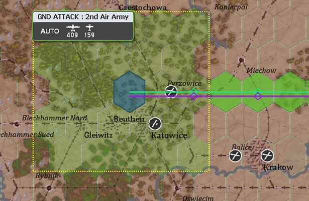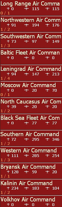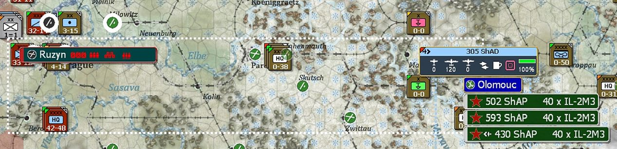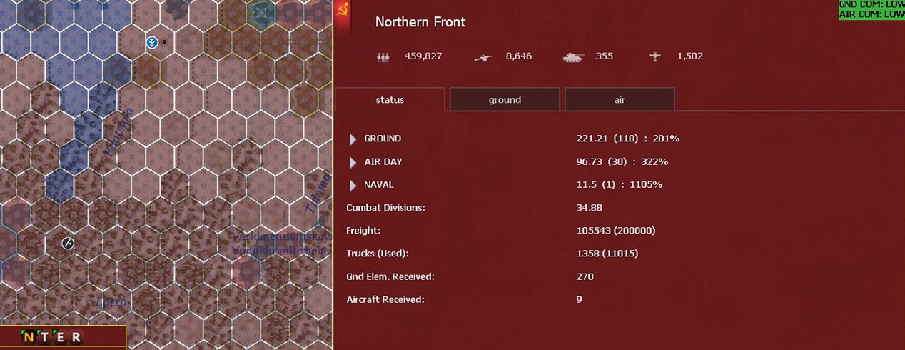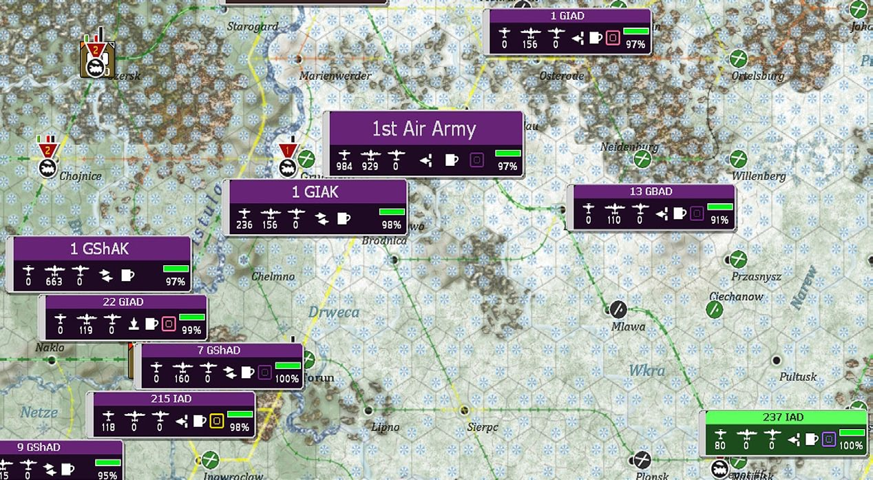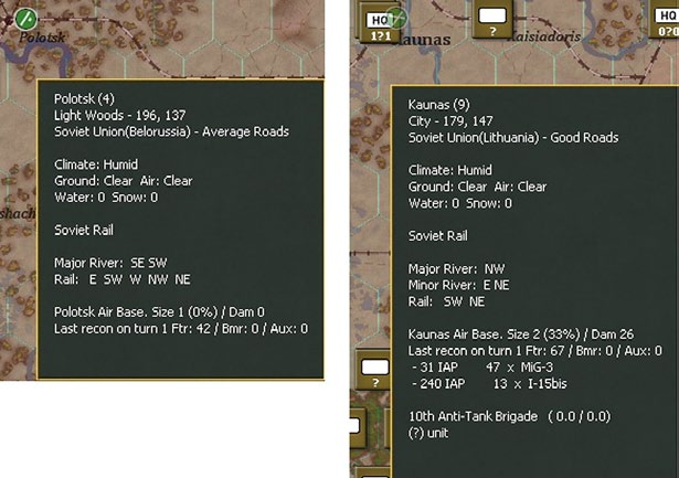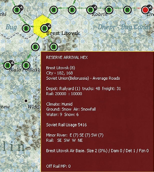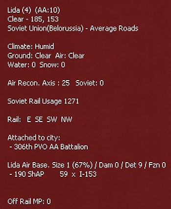 - Show interdiction levels: shows the interdiction level of a given hex, note that interdiction can be generated both by air attacks and Soviet partisan actions;