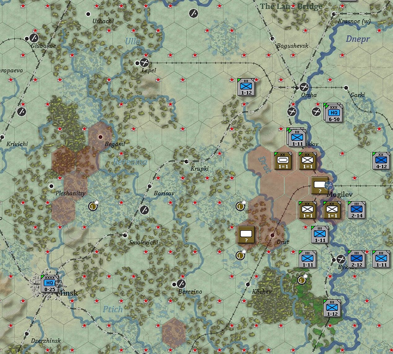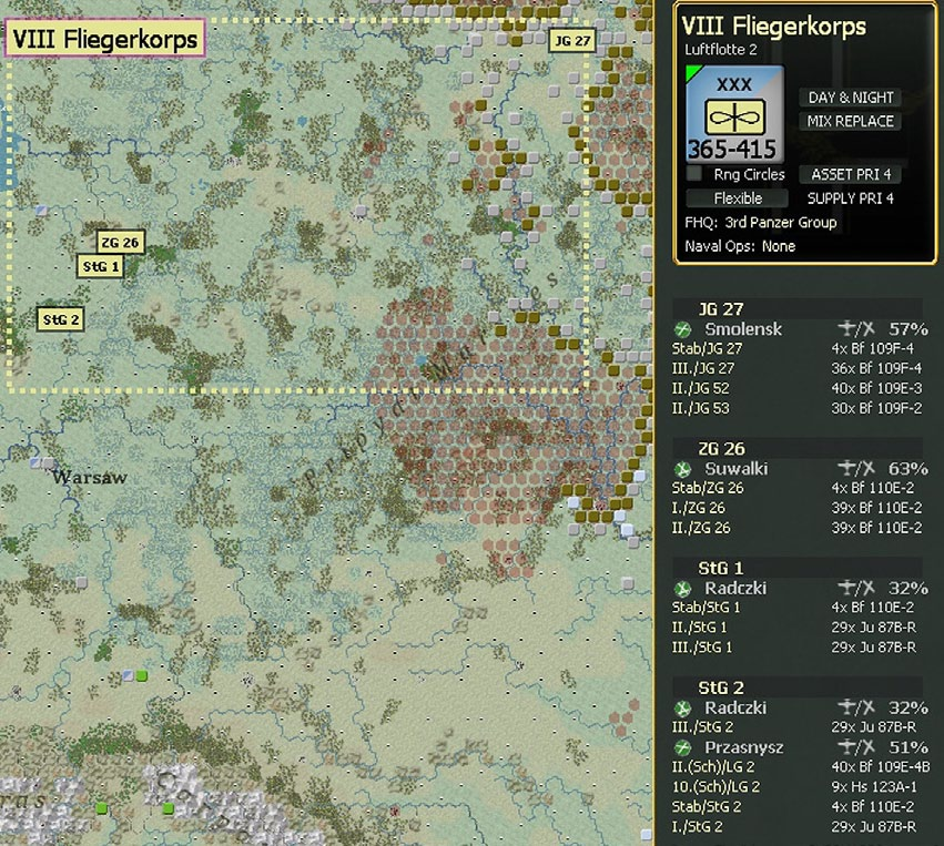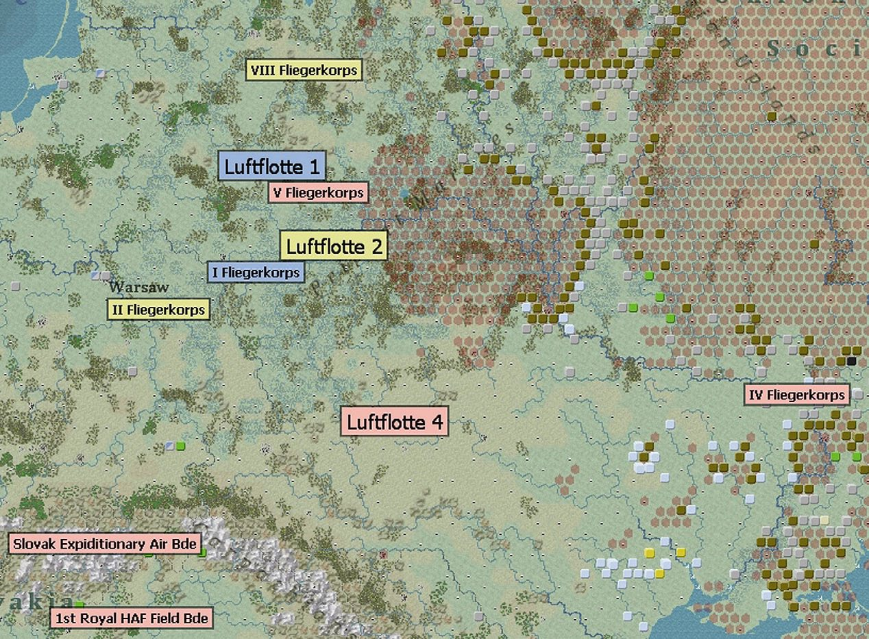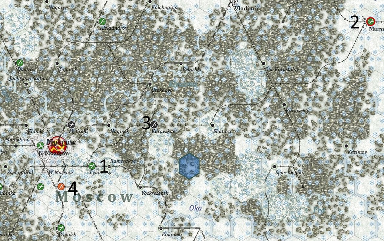 - Show interdiction levels: shows the interdiction level of a given hex, note that interdiction can be generated both by air attacks and Soviet partisan actions;