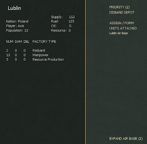 Note that if an airfield or a depot could be built in the hex, the option to do so will be shown here.
