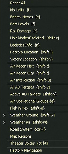 - Show air directive targets: Displays the layout of current air directives, can be filtered to all of these or only those aimed at ground targets;