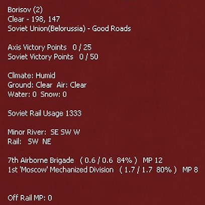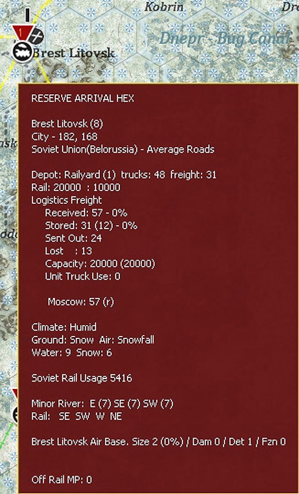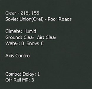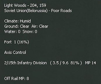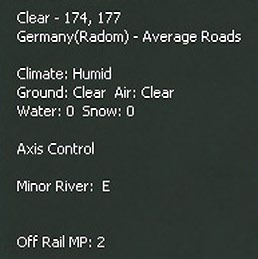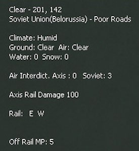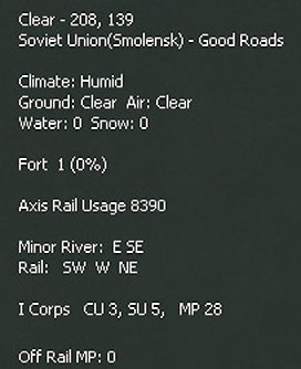 Placing the cursor over any hex will see a pop-up box. The information shown will vary substantially according to what is in the hex and any other choices (such as having selected the logistics display 6.9). This will always show the weather, terrain, any physical features such as towns or rail lines and if the hex is adjacent to a river. If units are in the hex, some information will usually be shown (again varying according to the Fog of War (10.2) and other display choices).