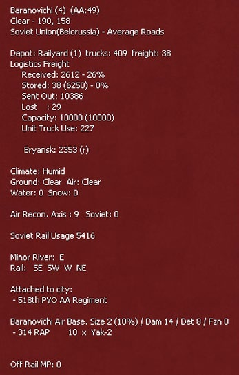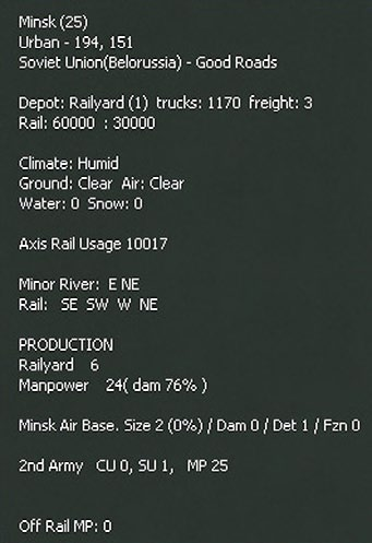- View Rail Damage Info: Displays status of railroads in friendly and recently captured friendly hexes.