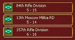 Here a Soviet tank corps has been broken down and one element now reports to a different HQ. However, all 3 brigades are highlighted in blue in order to identify them on the map as coming from the same original formation.
