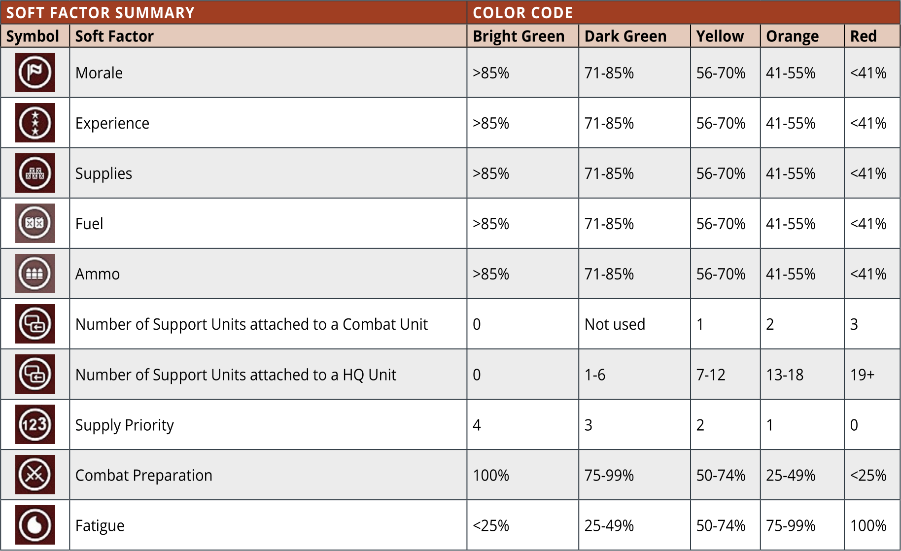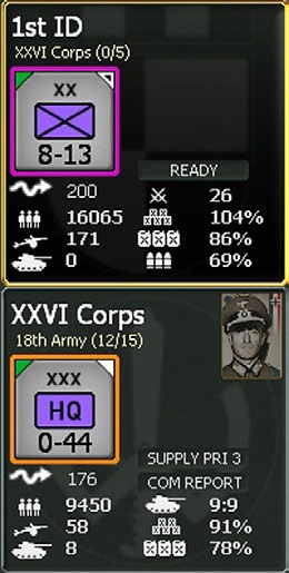 - Supply priority: This will show the relative supply priority (from 1 to 4) of each HQ and their attached combat units (6.9.3);