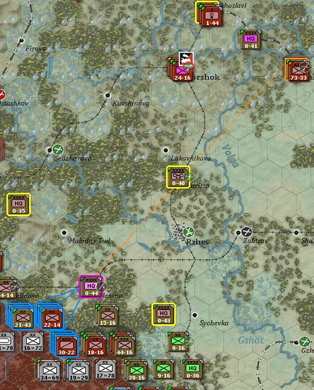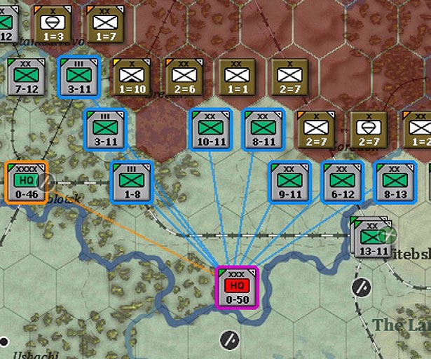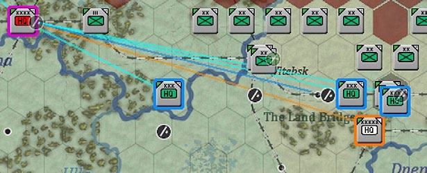 Here a Soviet army has been selected. All its subordinate units are in command range (outlined in blue), other HQs in the same Front are outlined in yellow (as would any combat units that reported directly to the Front HQ), the Front HQ is outlined in orange. The connecting lines match the colour surrounding the relevant units to show the direct command relationships.