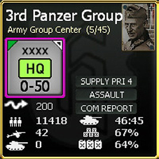 The example above is at the most detailed level Units in the Theatre boxes can be handled as units on the map. Clicking on a unit will bring up the detailed unit tab but with the HQ related information missing.