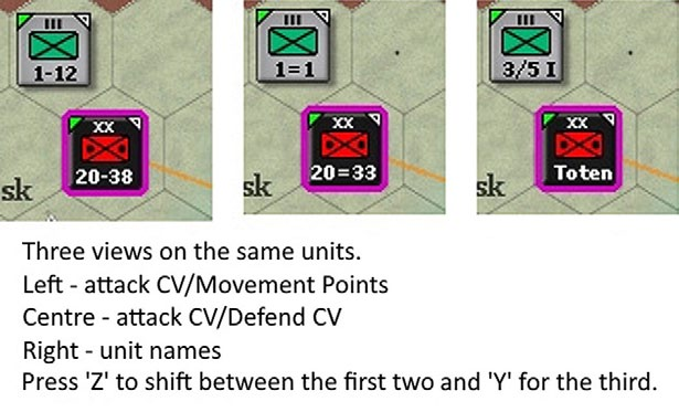 - View Unit Modes/Isolated: Highlights on-map unit counters with a colour border according to one of five different modes. This will also identify units that have just arrived that turn or are due to withdraw in the next 5 turns;