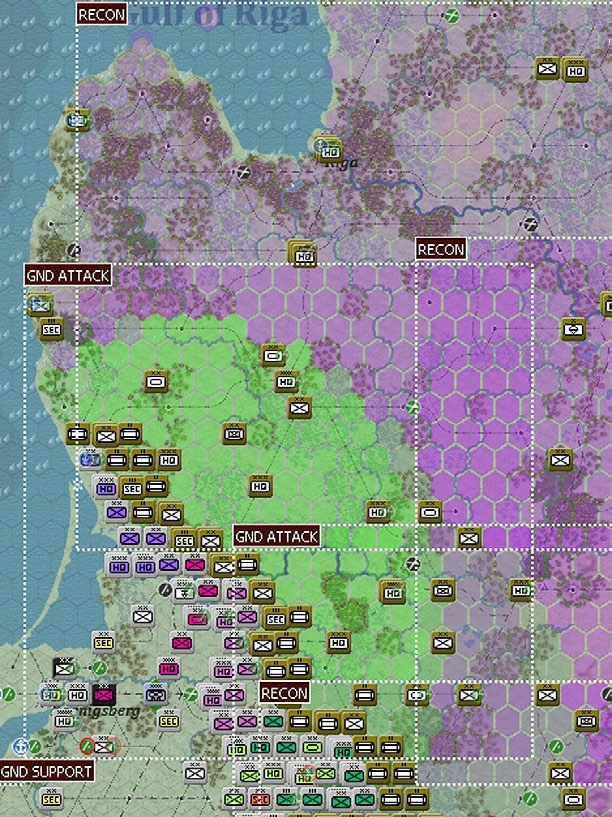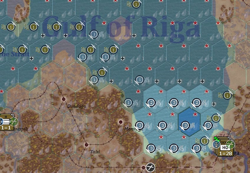 This shows the naval interdiction off Riga after the German air phase on T1. A naval air directive has allowed them to take control of the hexes immediately around Riga (even where there is also Soviet interdiction the German value is at +2).