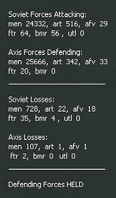 - Display Turn Summary: Brings up a useful quick summary of major changes in the last turn to both sides OOB, identifies units that maybe low on supply and the current situation in respect of the victory conditions (36.16).