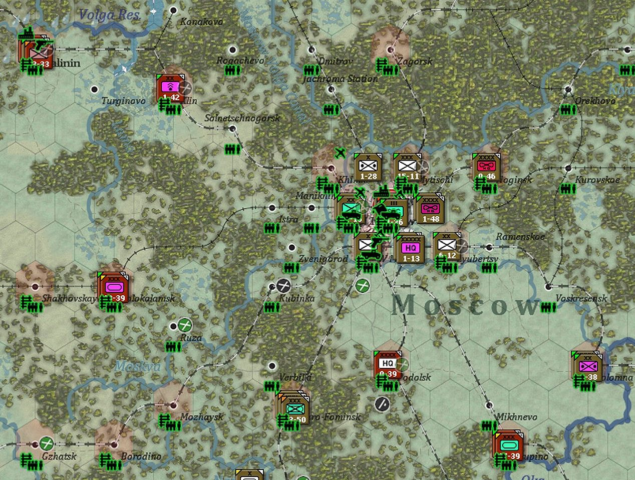 In the example above, the quickest (in MP) movement path is shown for the unit and the dark grey hexes to the west of that location indicate it lacks the MP to move into that zone.